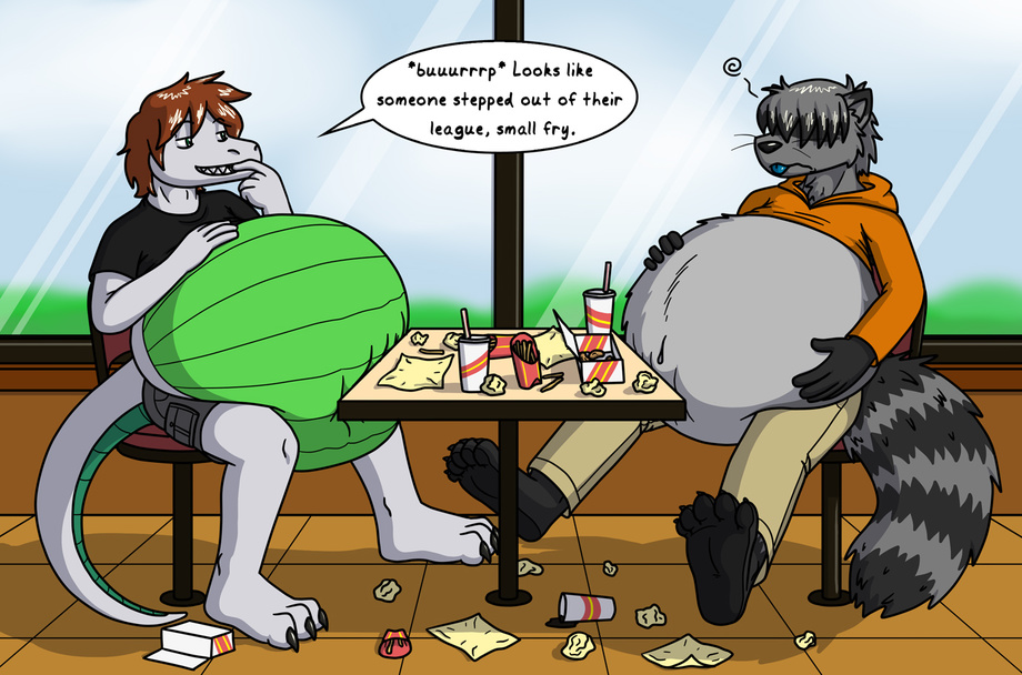 Aussie and I have been engaged in a bit of a size half-inspiration/half-contest thing over the past couple of years, sort of putting :iconimmelmann: in the middle. It started with this commission of Aussie's from way back, wherein I got inspired to get this commission, which inspired Aussie to get a spiritual successor to his own drawing with this commission, which inspired me to get pretty crazy and get THIS commission! And now I suppose now it's all culminated into this picture, cutting out the middle man and just having a straight-up size competition between the two of us. First to touch their tail tip wins!