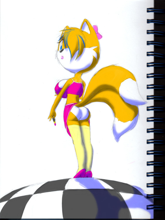 Oop! Sorry there, Tailsko, did we catch you at an inopportune moment, being girly in the privacy of your own home? Well, the least you could do is learn how to loop your tails through that skirt! Silly girl. :>