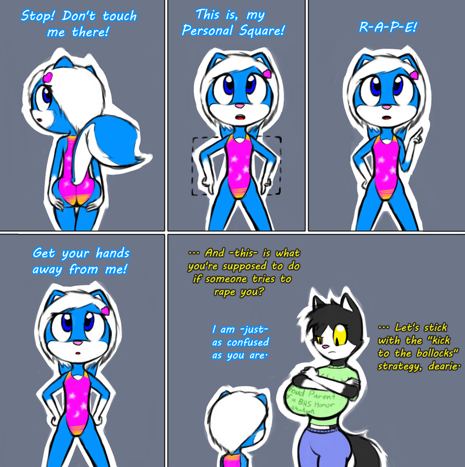 You know I think the part where she covers her rump might ENCOURAGE pervs. XD I think the kicking them in the bollocks would work MUCH better.