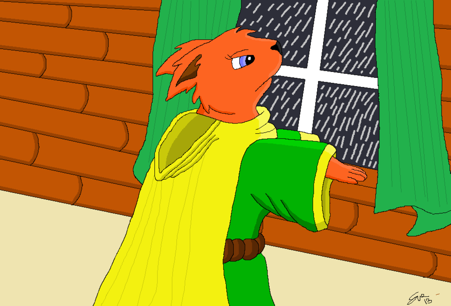 Squirrelette looks at the window. rain poured down as she felt sad that day.