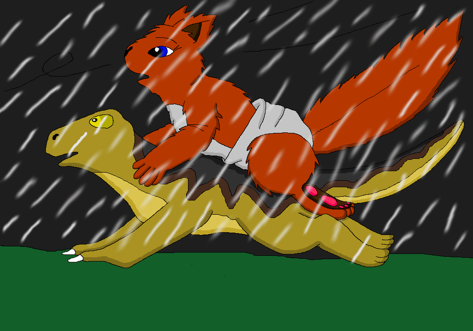 Little squirrelette gets a ride on her guardian lizard pet Courage. they head off in the rain to find her father who was missing