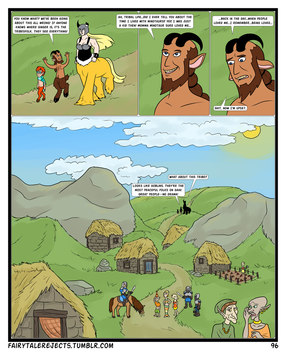 The presence of soldiers makes me wonder just how 'peaceful' and 'drama-free' the situation actually is. Going to be interesting, and by interesting I figure that there will be action and drama forthcoming. The angle is such that the new arrivals probably dont see the soldiers just yet, and end up facing some curious stares of their own when they walk in. That's my interpretation at this point anyhow.
