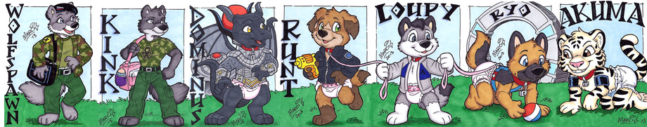 Art By Marci ( https://www.furaffinity.net/user/marcimcadam ), gifts for Fiona Runt and Ryo. Dominus bought his own to join the team. I bought one for father's day for my daddy Kink. Birthday gift for Wolfspawn and Akuma and now the set is complete.