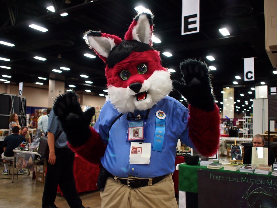 The last one in this set is actually from the first day of the con, on my second session fursuiting, as I was walking around in the exhibits hall. Photo by Geoff Livingston.