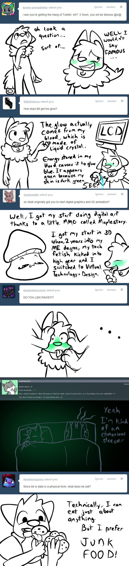 Depending on the volume of questions I get, I might be answering a lot just in text. If you want, you can ask questions of other characters of mine, like Byte, Leona, Kaelem, etc.