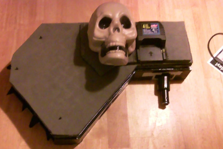 Here I have my chainaxe head. I've built up the head using PVA foam. I then placed the skull over the engine mount, next to it is the battery pack mounting.