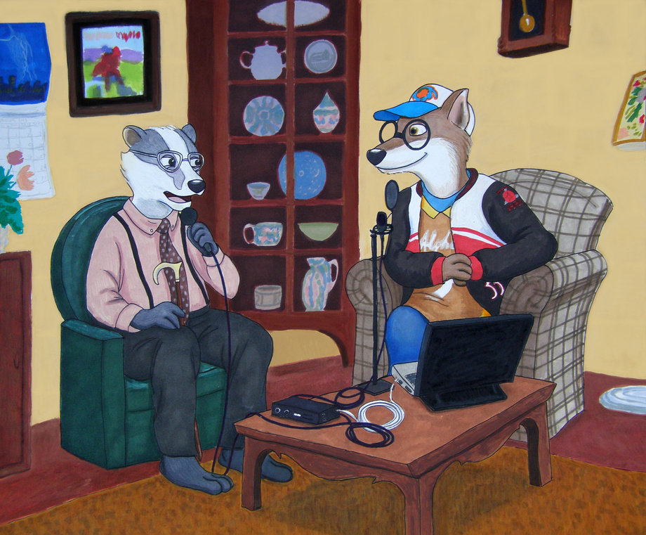 "Coyote On The Court" T.Matt Latrans (r) is interviewing former basketball coach Brock Thiessen, 104, about his days as a coach and, before that, a player.