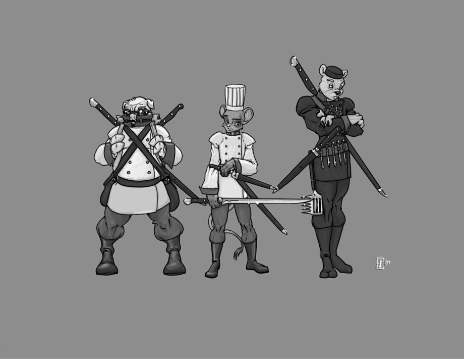 In the Middle is the Chef. Chefs serve in the legions as the knights or Samurai. Upon being granted there second sword they hone not only there fighting skills but there leadership and tactical skills. At any time a Chef could be expected to lead a force of men into battle and weather they are trained cooks or simply men at arms he is expected to do so with courage and honor. They are more versatile then there average cook of the line as well being at home in most any kitchen or campfire and will have a much wider selection of dishes to choose from.