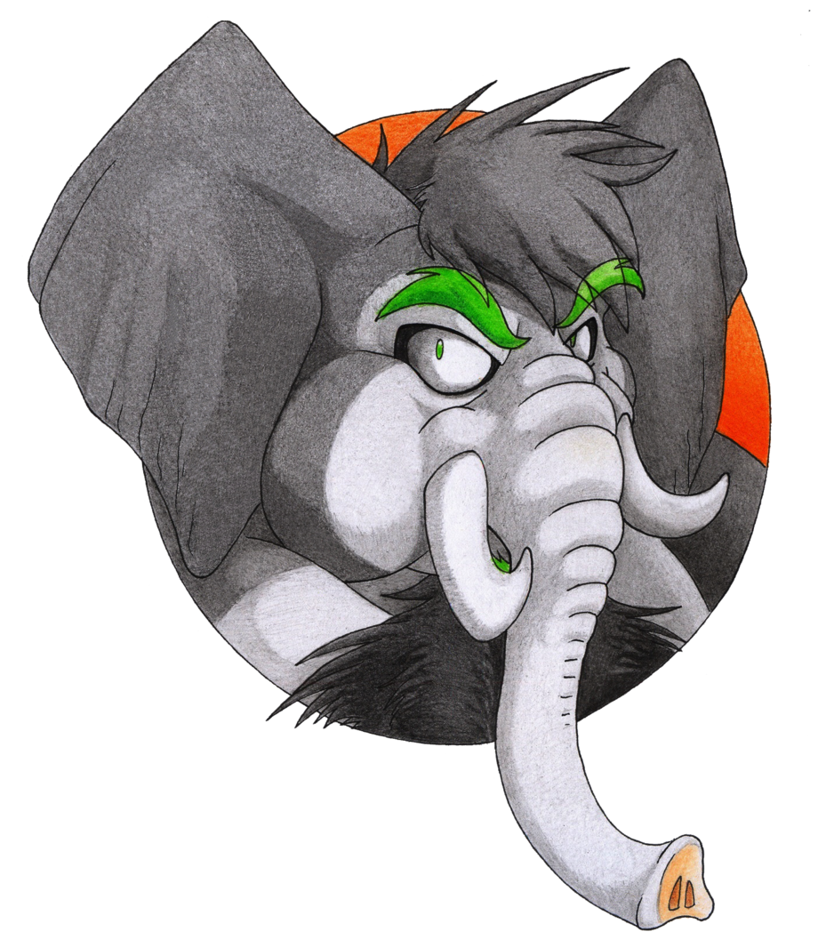 A badge with evil EleDan >:3 He's my wolf fursona,also a shapeshifter,that's his chubby elephant form OwO It turned out better than I expected,I like his trunk x3