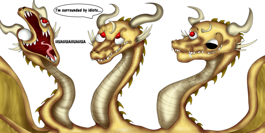 So I thought what if the middle head Ghidorah was normal, while the other 2 are complete idiots XD