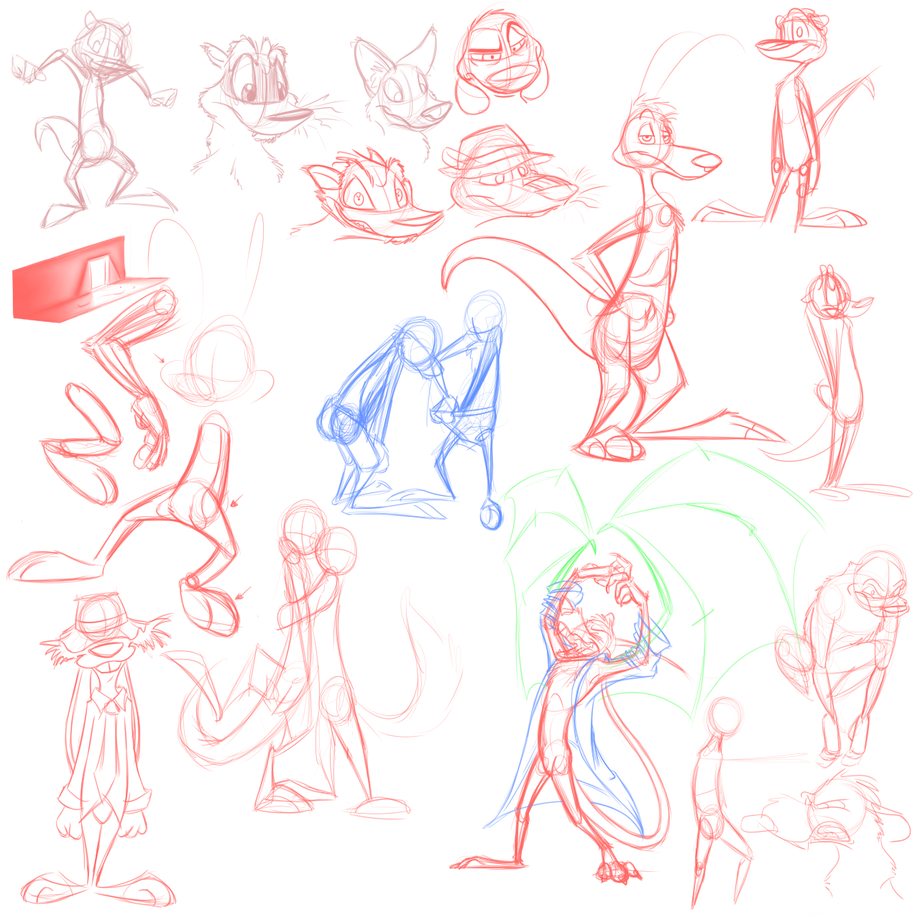 All sorsa stuff. Weasels, kangaroos, winged rat scientists, businessbunny, a big ol' hug, angry rat, etc...