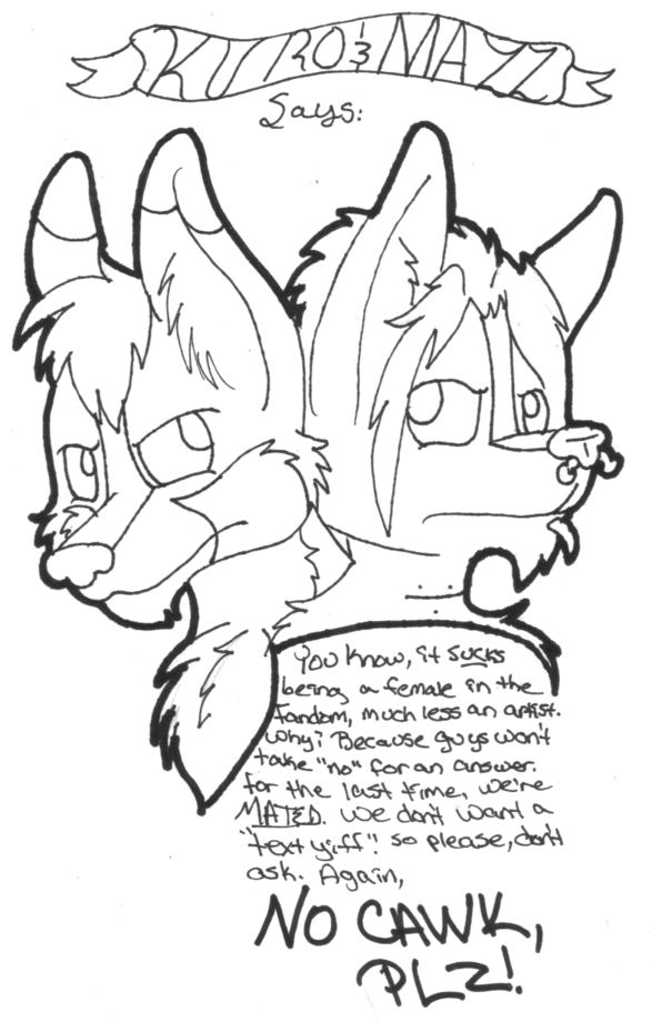 The text reads as follows: You know, it sucks being a female in the Fandom, much less an artist. Why? Because guys won't take "no" for an answer. For the last time, we're MATED. We don't want a "text yiff", so please, don't ask. Again, NO CAWK PLZ.