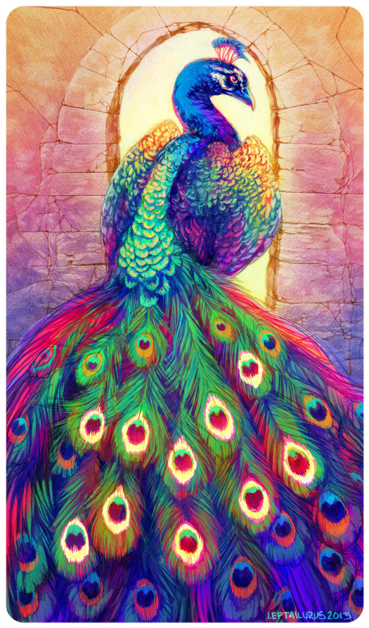 Phew! This card was a challenge. I wanted a plethora of vibrant color which made rendering the peacock's feathers quite a pain... admittedly this is the first time I have ever painted a bird!