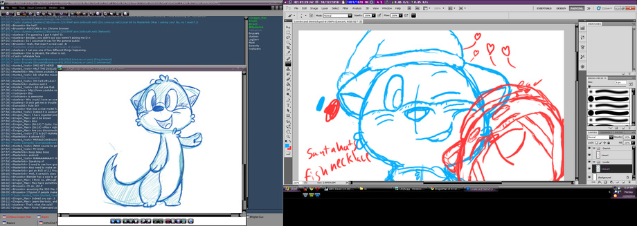 On the left is my mIRC window as well as a reference for one of my characters, on the right monitor is my Photoshop window and fun things like that.