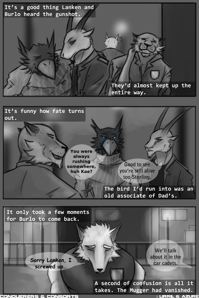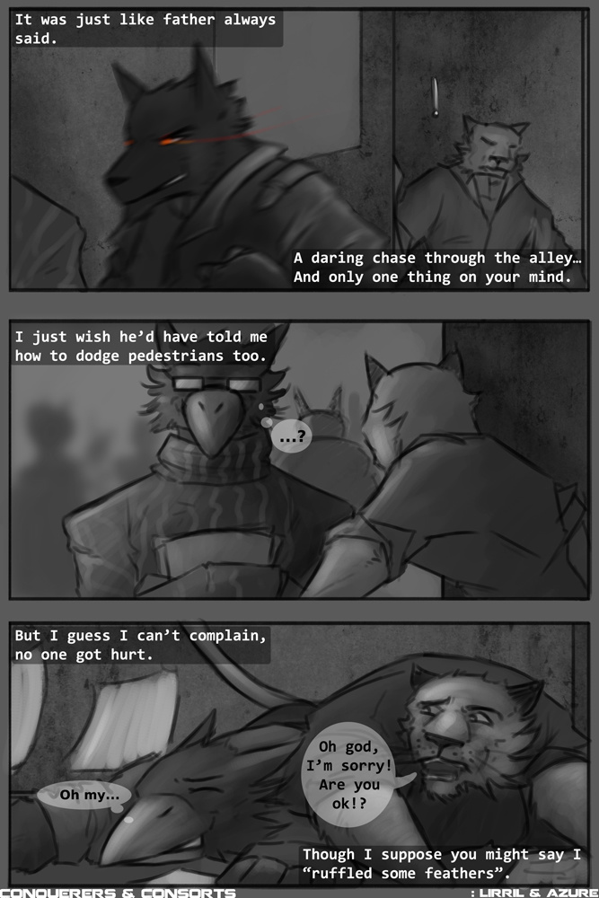 As he careened out of control, crashing to the floor in a heavy pile atop a feathery, formally dressed Avian, Kaeryl got one last glimpse of the strange Lupine that he'd been pursuing.