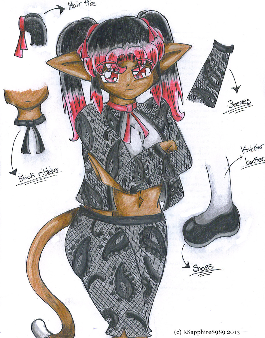Artist's note: This is one of many outfits of Ki How's wardrobe. This is particular outfit is worn when she has to visit the Bloodscar clan. I was going with an 18 century, male garb. Since Kitty seemed to more gentle and femininitic when in combat and presentation. While Ki How is a lot more aggressive in combat and wish to be in clothing that is easier for her to move in. *mews softly* The Bloodscar are an european based culture with 18 century and victorian, futuristic flare of fashion. *mews softly*