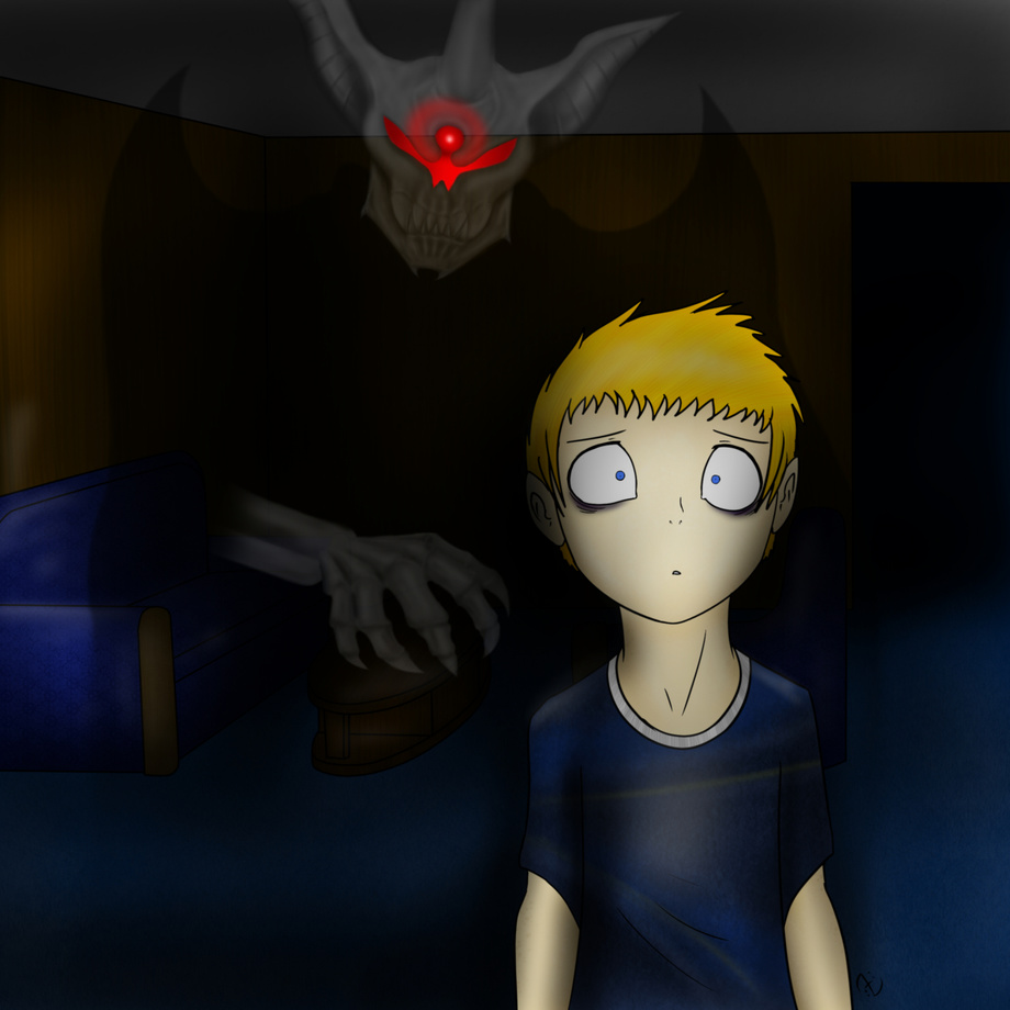 Late one night in my childhood , I restlessly crossed the dark living room to the kitchen to get a Drink. Upon my return to my room I glanced out the window and in it's thin reflection I saw Behind me , standing in the corner of the room , a tall shadow. Frozen as I realized it was shaped like a person but with horns ... the front of it's face started to glow as it approached. it's face more clear .. I noticed it's hand reaching for my shoulder ~ It felt as if it was pushing through a magnetic field ... the pressure like a tree limb bending about to give way. A snap in my fear I was able to summon the ability to run. Like most children I hid in my bed ... unlike most children I didn't have a fear of the dark till that night . To this day I carry the fear of reflective surfaces in the dark . I dunno what I saw that Night ... but all I do know is that a few weeks later ... my grandpa died
