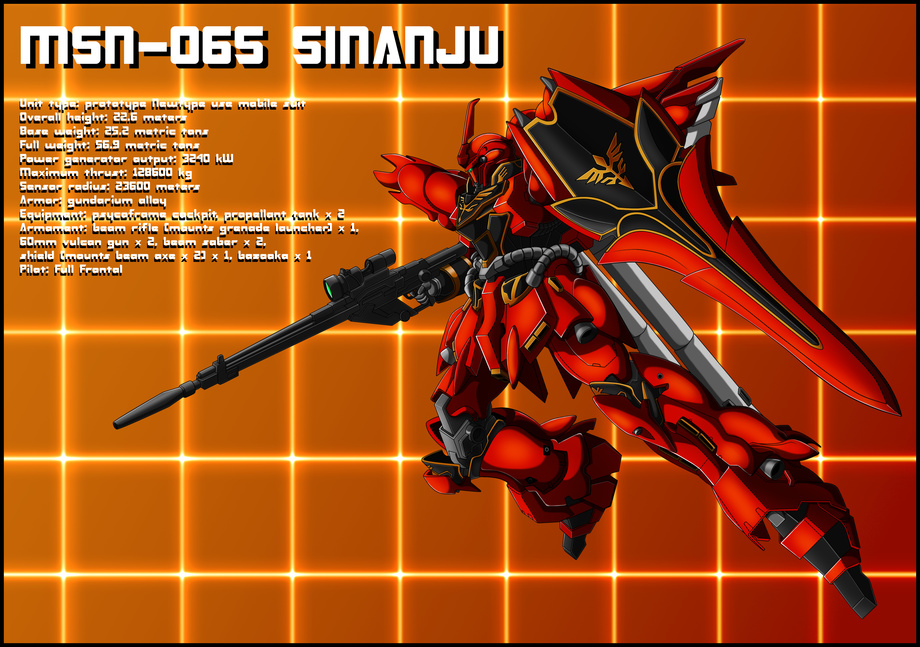 The Sinanju piloted by Full Frontal in UC 0096 is actually a modified version of the MSN-06S Sinanju Stein. The data from the Sinanju Stein was used by Anaheim to complete the RX-0 Unicorn Gundam. In UC 0094, the Sinanju Stein was stolen (disguised as a transfer) by the remnants of Neo Zeon, "The Sleeves". The Sinanju Stein was slightly modified into the Sinanju and used as the personal machine of Full Frontal.