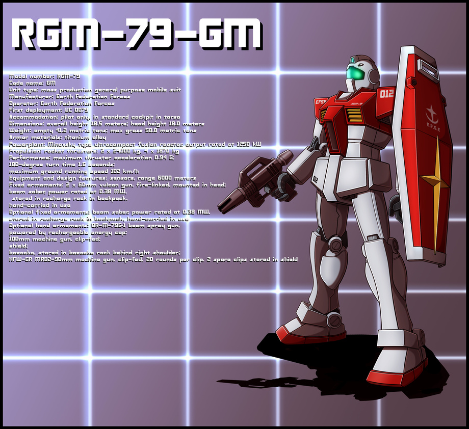 Not initially taking the threat of "mobile suits" seriously, the Earth Federation Forces are a latecomer during the One Year War when it comes to the development and production of its own mobile suits to counter the Principality of Zeon. Based on combat data from the RX-78-2 Gundam's "learning computer" system and experimental GM-type units such as the RGM-79[E] GM Precession Type, the Federation's first true mass-production unit is simply named the RGM-79 GM. The production-model GM is basically a simplified version of the original Gundam, eliminating some of the more complex and expensive features - such as the Core Block System and using normal titanium alloy armor instead of lunar titanium - to make its production faster and more economical. The GM only carries one beam saber instead of two, and has optional hand armaments of either a 100mm machine gun or a short-range - but highly effective - beam spray gun.
