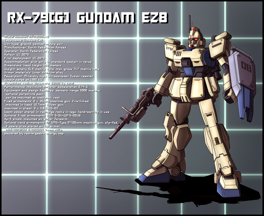 The RX-79[G]Ez-8 Gundam Ez8 (short for "extra zero-eight") retains the same beam sabers in the legs, as well as the standard RX-79[G] hand armaments. However, its other fixed weapons are changed out, with a pair of 35mm machine guns mounted in the head and a turret-mounted 12.7mm anti-personnel machine gun in the chest. The Ez8's armor plating and placement is improved overall, and the traditional Gundam "V-fin" on the head is replaced with a sturdier communications antenna. The Ez8 retains the backpack equipment rack from the standard RX-79[G], allowing it to keep its ability to mount parachute packs or other field equipment options. In December, the Ez8 is heavily damaged during an attack on a secret Zeon base housing the development of the advanced Apsalus III mobile armor.