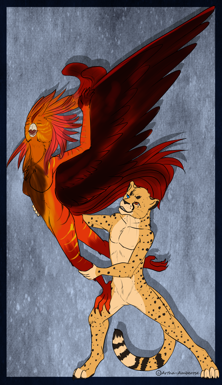 Commission for Kujura. Their Cheetah Sona ballroom dancing with my Phoenix.