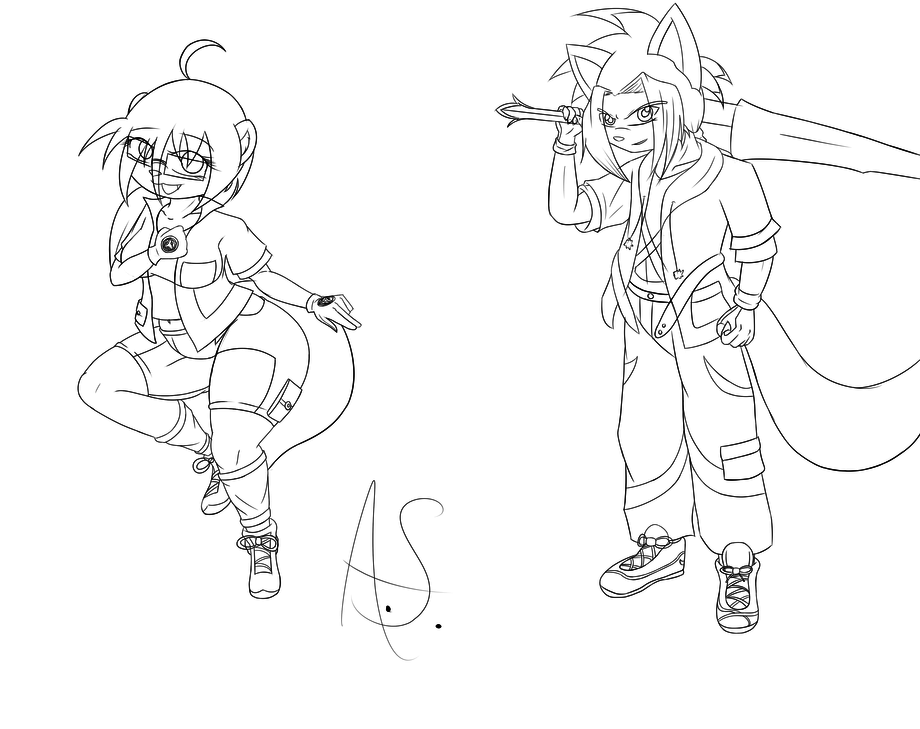 Hoo boy it's been a bit since I seriously felt like uploading stuff. I've been feeling less and less like doodling, then more and more like it in random times. I've been thinking about my characters, I didn't really like their current look before, it was okay at first but after this whole skip thing they were in serious need of new duds, so I decided I would pretty much wing the entire process and design the clothing from my mind and my mind only and the result was well this lol. I honestly like how they came out, and the lining ain't half bad considering my skills.