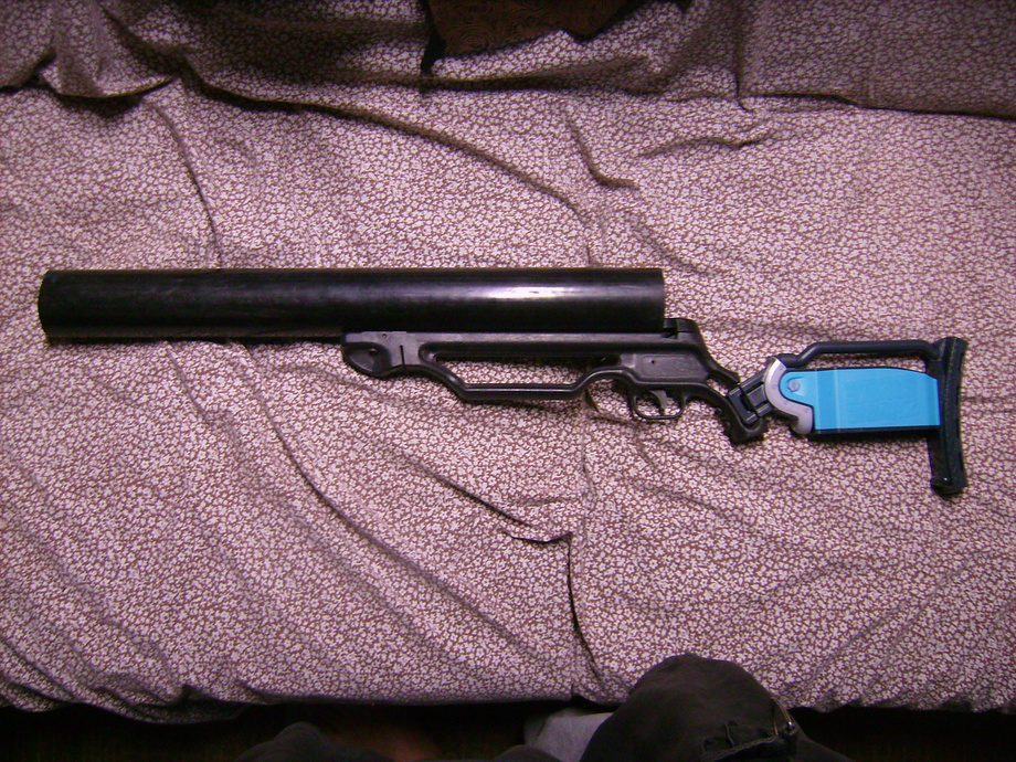 an idea I came up with, the body was a crossbow that didn't work right, the stock has been replaced by my Nerf Sledgefire stock (Now Side Pocket), and the barrel is a 2 inch PBC pipe