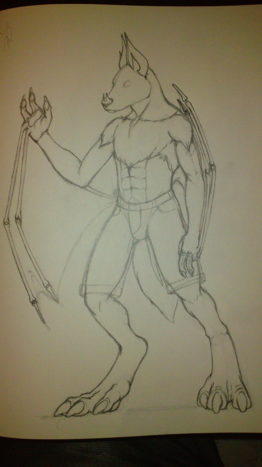 well here is my progress for the bat i'm slowly working on. i'm happy how his wyvern feet turned out and i was slightly drooling ^w^. anywho i put some shorts on him and trying to do the fly was a bit akward cause of bat parts ( imaaaagination) was though of. i sketched out the wing membrane and added a elbow bone so it still gives the look for the bat's natural wings in real life. though they have four but FUCK IT IM A CREATOR LOL. i added his nose tips (since there are two ) and noe i need to go back and detail the shorts, and his pecs cause im not good at them but its a start.