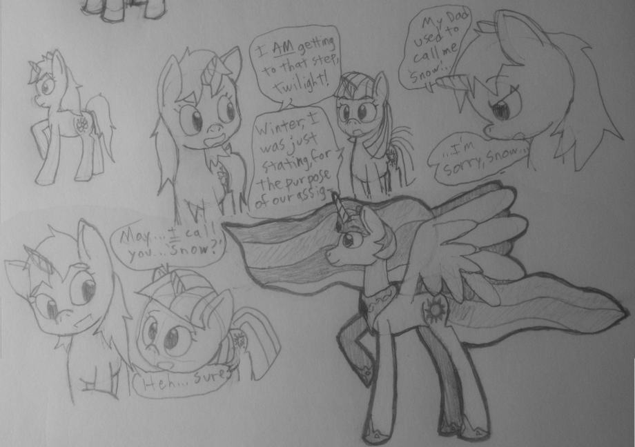 4. Short comic to see if I could comic; idea was Snow (also known as Winter?) and Twilight at magic academy in class working on project. Celestia snuck onto this sketch (based entirely on memory) :3