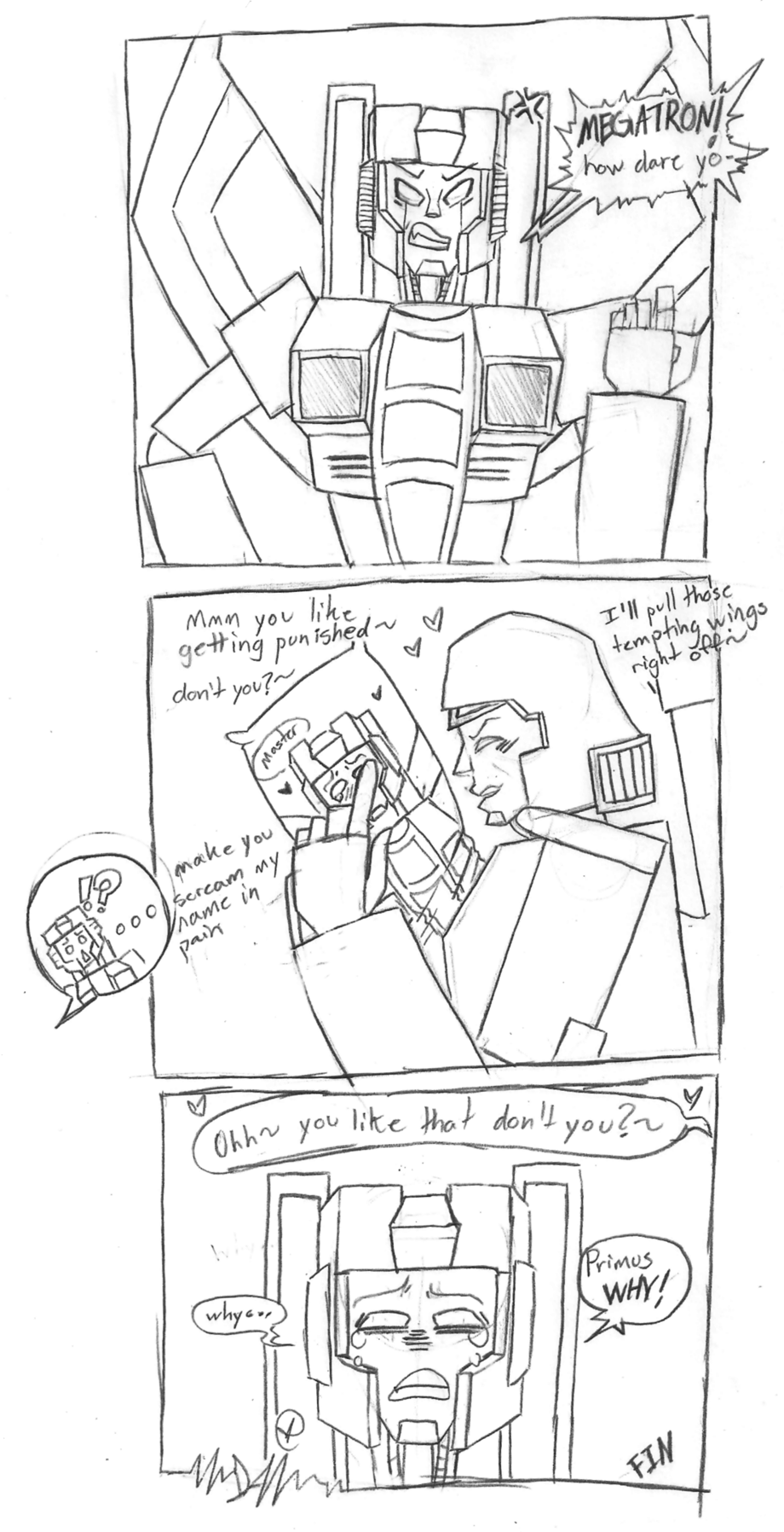 Word of warning I haven't had a whole lot of practice with Transformers anatomy but I'll do my best. Now what or who would you like and what would you like them doing?