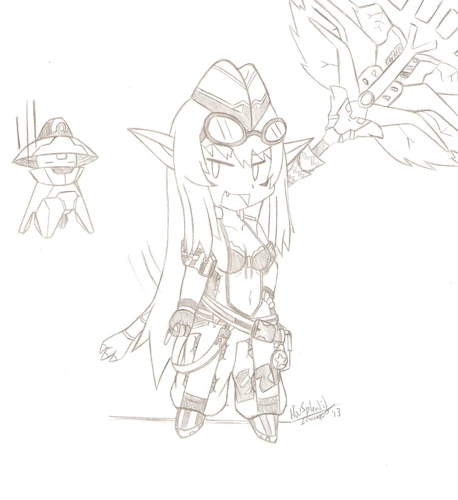 Well time to continue this ongoing series. This time I decided to give my newman character Rain some of the spotlight. This one took longer than I thought, because I wasn't planning on drawing her falz staff or mag, but it never hurts to include them, right? ^^;