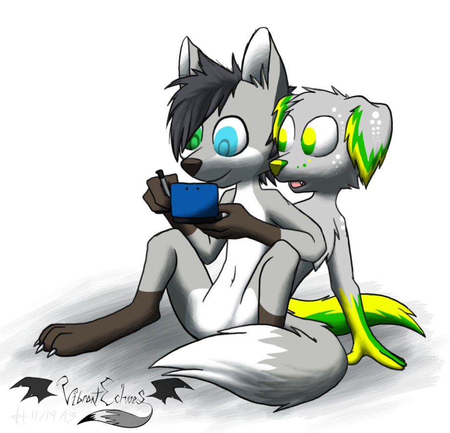 OtakuOkami's simple shading commission of Rudan playing a blue 3DSXL while Spritz looks on curiously.
