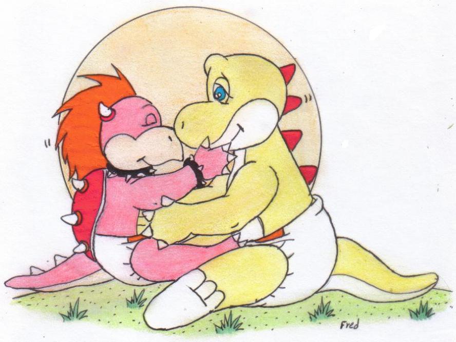 and Showtime snuggling on the grass, during what is either sunrise, sunset or a full moon.