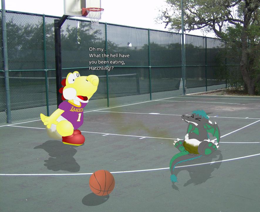 Showtime and Xan were both playing ball before the urge of nature hit them both. Show fills his diapered seat quite a bit, being the yoshi that he is. Xan, however, being a dragon with three stomachs, continues packing his own, leaving a rather strong odor that seems to overpower Show's olfactory glands. Guess the yoshi could dish out but just not take it.
