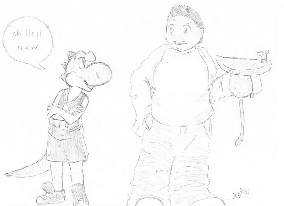 Showtime standing next to Gabriel Iglesias, smirking. It's obvious what Mr. Fluffy wants, yet Show seems to not agree with the idea, though somewhat amused by his larger friend's suggestion.