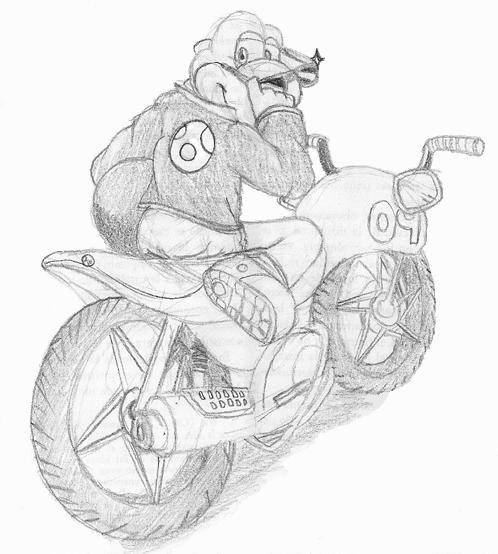 Showtime taking a moment to pose as he gets on his bike, sporting his leather jacket and sunglasses. This yoshi has no worries when it comes to constant pit stops and proper cushioning, considering his other attire.