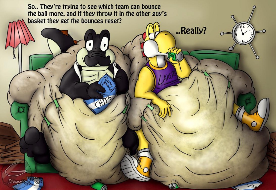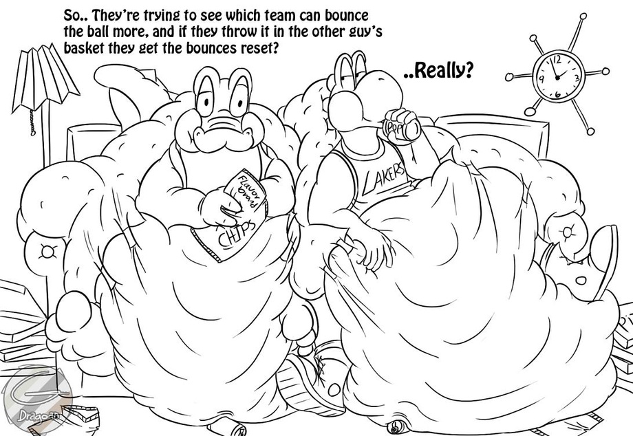 Showtime and Dragoan sitting on a couch in their squishy filled diapers watching basketball. Apparently the silly gator has quite a bit to learn of the sport, starting with scoring.