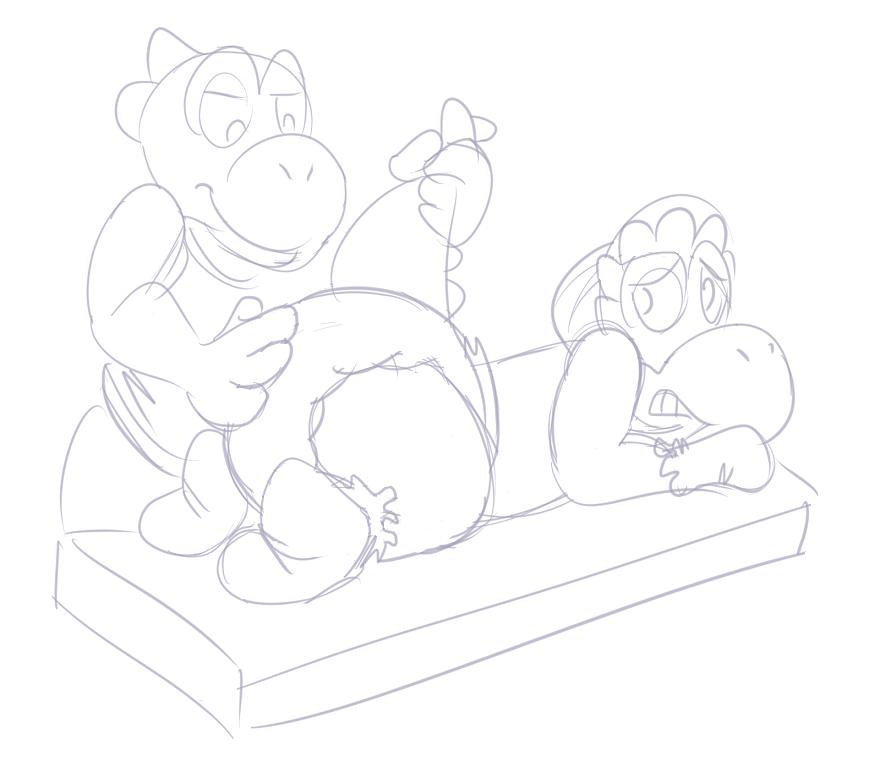 Showtime patting Rogueyoshi's thickly padded bottom. Seems the smaller yosh doesn't want such attention (even though he really does).