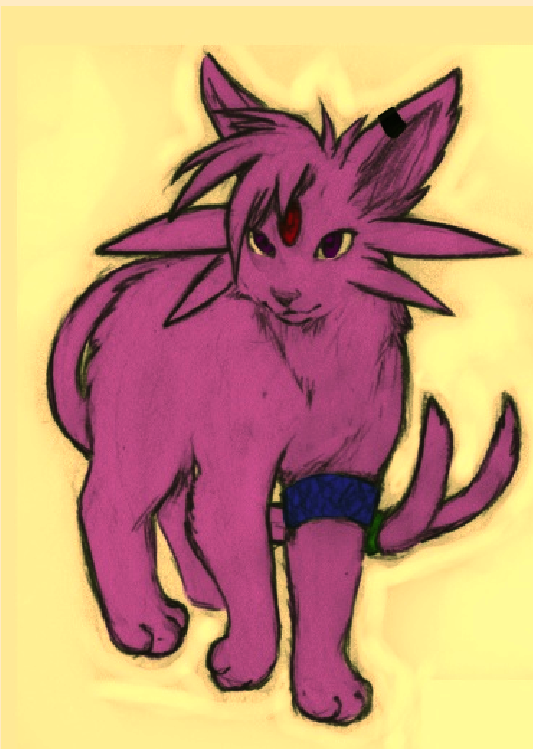 A fluffy purple espeon with a tuft of fur spiking out almost over his right eye. Just under the split of his tail he wears a simple green iron tail band. On his left foreleg he wears an armband made of blue dragon scales, at the center of which lies a gem made of crystallized blood.