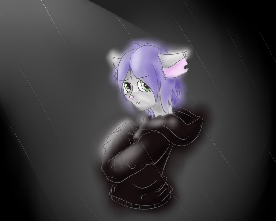 Idk, Penny in a hoodie, in the rain, near a streetlight.