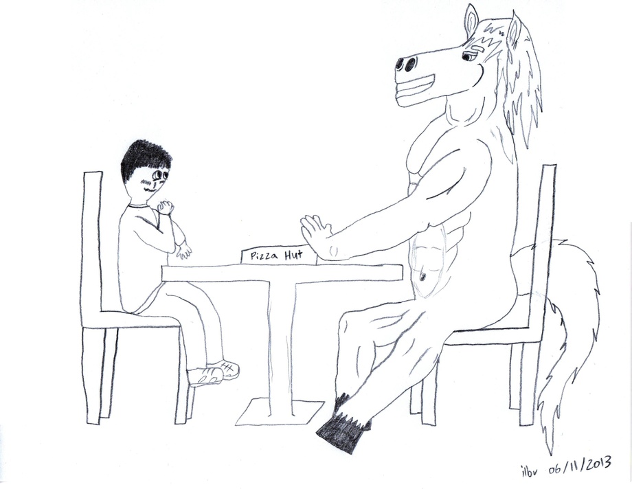 Thunder had ordered Pizza for himself one night when Jett was out and I was at work. I came home hungry and tired and didn’t find anything in the fridge. I joined Thunder at the table just to talk to him and see how his day had been, far too shy to ask for some of his pizza. Thunder being the gentle and caring horse he is, offered me some of his dinner…later on of course making me apart of it.