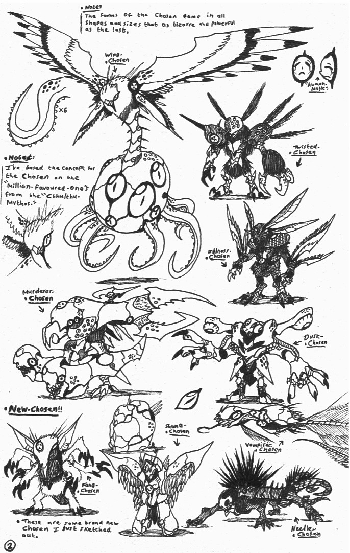 This is a couple of sketchbook-page scans of my monster-group, The Chosen. This includes four brand-new Chosen.