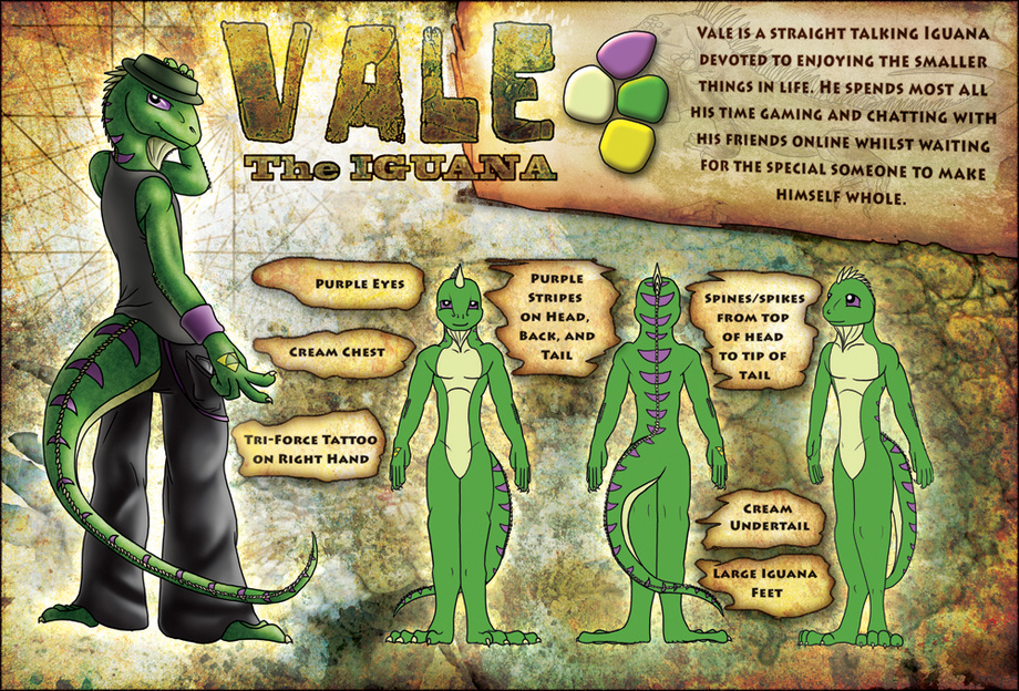 Vale stands at 6 foot 2 inches (187cm) and weighs around 130 pounds (58kg) he's mostly green aside from a cream coloured chest and underside with purple stripes from the back of his head down to the tip of his tail. He has a Triforce tattoo on his right hand.