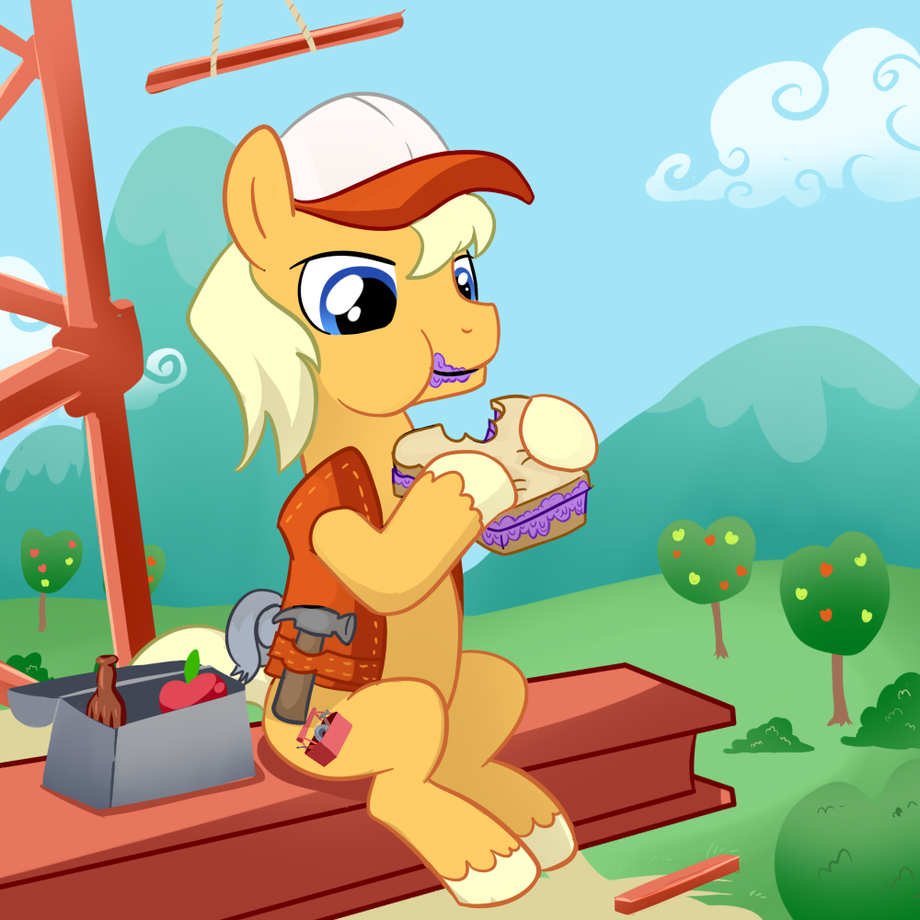 CSImadmax over on DeviantArt did this cool commission of Handy Hooves, enjoying a nice jelly sandwich on his lunch break. Enjoying the view of Sweet Apple Acres it seems!