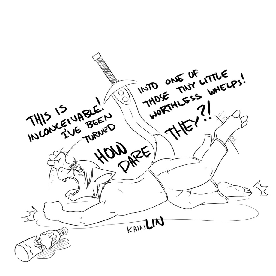 Hooo boy. Kain never saw Gremlins as anything but obnoxious pets, a species quite below his. One night being drunk in a tavern, guess he accepted some sort of drinking challenge one proposed to him. "You want to see who can drink more of your kinds strong stuff? bah! Its probably got less bite than this cheap ale! I accept!"