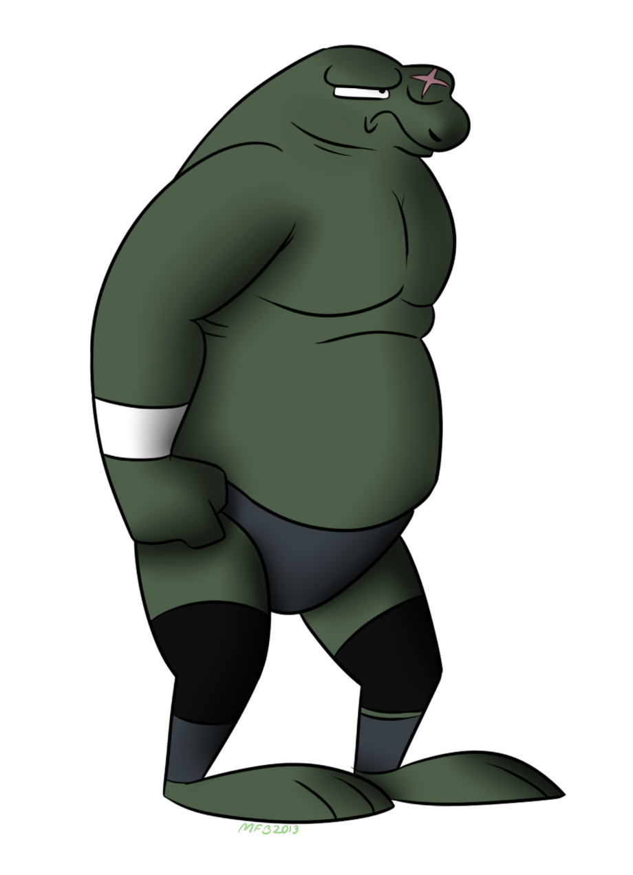 He has dark green-ish skin, he's got a x-marked scar on his proboscus from his last fight he was in as a bouncer. He is a big dude, barrel-chested and beer belly all in one.