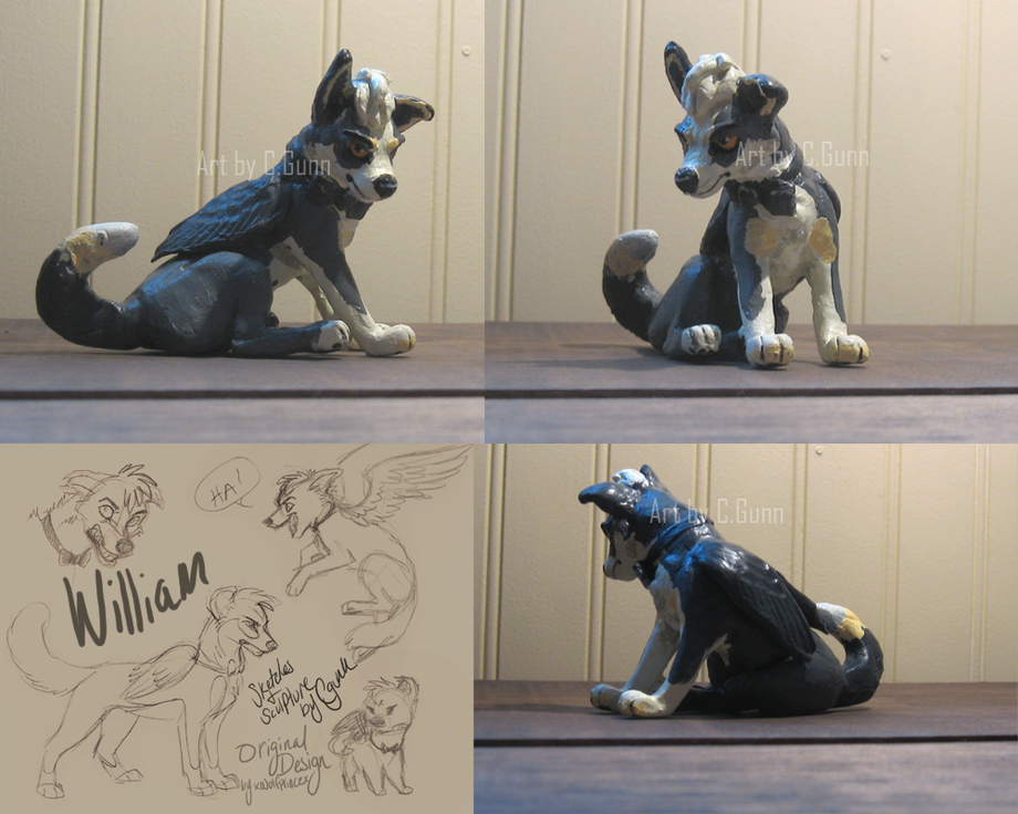 I just recently bought this character but really wanted something solid of him because sometimes just drawing a character isn't enough for me. So I made this yesterday. Took me about 6 hours, too much stress (painting sculptures stresses me out just as much as baking them after one of my sculptures had a horrible tragedy befall it while baking). I am really happy with how he turned out though, and I love my new baby William. :3 I threw in some of the sketches I have been drawing of him too. :)