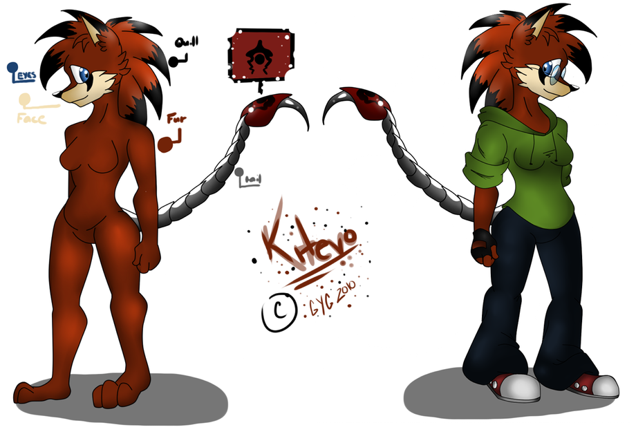 Her tail can be disconnected anywhere at any time at her liking; her tail detaches at the tailbone and can be replaced with another from Kitevo's toolbox. However, as a full tail-transplant takes the better part of a few hours, she often uses the nanite colony embedded in her tail to change the tips [from the red marker to the end]. She most often wears the Manticore-styled tip, but if needed she changes it into various tools to help her with her work.