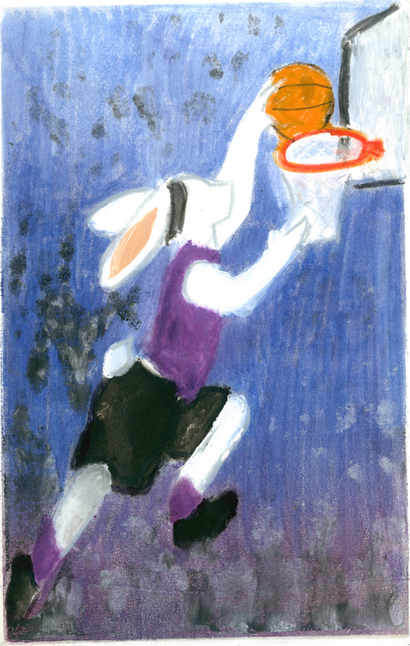 Some time ago: ―"But Patrick, I don't care about basketball...!" ―"I know, kiddo, but my manager gave me these tickets, so I thought this might be something we could do together. Besides, being at the game is always different than watching it on television, and I thought we could make a day of it - forget unpacking for the weekend and see Plymouth, get some dinner and watch the game." ―Lance sighed. He knew his brother needed to move to the East coast for work, but so far, for him, things kind of sucked. He'd made a couple of friends, if you could call them that, but most of his classmates already had developed friendships over the previous years, and it was very hard to break into the cliques that were near water-tight. Worst of all, his new school didn't have a track team, so that idea was out - he wasn't much interested in any of the other sports the school offered. Especially not basketball, which seemed to be the most popular sport at his new high school. ―The day they had was admittedly fun, though. He wasn't terribly impressed by Plymouth rock ("Hoo, boy, that looks great under the plexiglass.") but the town itself was pretty neat. It seemed to him that Massachusetts had more history than California. They found a quaint hole-in-the wall to eat at, and the food was quite tasty. ―As they walked into the arena, Lance was impressed; it was larger than he expected. What's more, the seats his brother had gotten were just 6 rows from the court. There was so much to see in the arena, that he almost forgot they were going to see a game. ―He glanced at the program - the Taproots were playing the Stanislaus Thrust, and his heart ached for the West Coast once more. He was so lost in thought that he didn't even realize the game had started - until he looked up in just enough time to see a rabbit jump up and dunk the basketball for the first two points of the game. ―That night, Buck Hopper commanded the court... and the young rabbit's attention. The Taproots lost that night, but Lance was secretly glad that the Thrust won, though he would never admit it to any of his new friends. Seeing the rabbit play on the court was magical - he was just so COOL! ―Maybe he would try out for this year's basketball team afterall... -- This is my second project in my monoprint printmaking class - buckhopper did such a great job with the draft last week, that I wanted to show him my support and thanks for all his hard work.