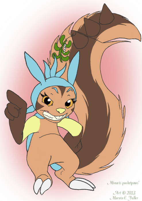 It was the grin that made this picture work for me. Previous iterations had Mima in the midst of battle, contorting her body as only a squirrel– er, Pachirisu can, but they came out looking horrible and unworthy of you or Mima. Once I changed tack and hit upon the grin, this picture just fell into place. On another note, I think this is the first Pokémon I've drawn since the early years of the franchise. On yet another note, Merry Christmas! :D